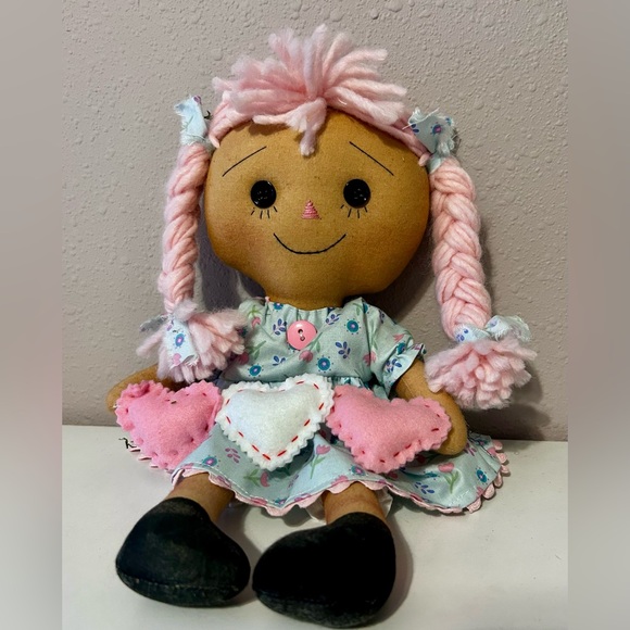 Handmade doll. This charming rag doll features delightful pink hair and a cute dress. The black shoes are painted on. This doll was used for decor only. In excellent condition.