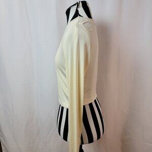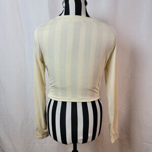 The shirt is size small, also referenced as a size 4. It measures about 17" across the chest and 16" from neck to the bottom of the cropped bottom hem.
