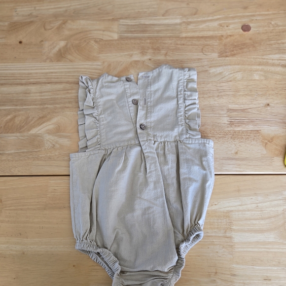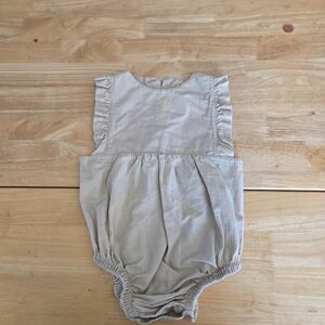 Charming baby romper with ruffled sleeves. Features button-up front. Perfect for any occasion.