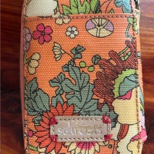 Vibrant floral canvas. Absolutely adorable. I think it originally had a strap to be like a crossbody wallet.
