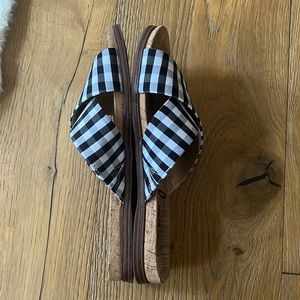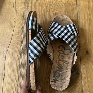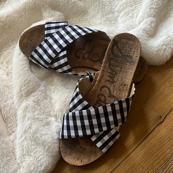 Super cute Sam Edelman buffalo plaid sandals! Black and white, with the tan bottom. I hardly used them, size 8US. Please see all pictures and videos and comment with any questions. Thanks for shopping my closet, bundle discount available ❤️