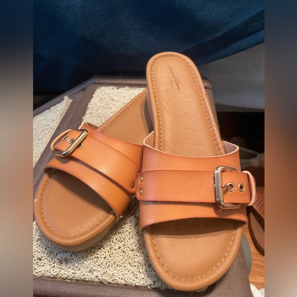 Leather-like buckle slides. Tiny flaw on front right shoe. Looks fantastic with skirts and shorts.