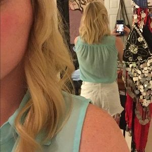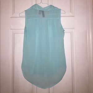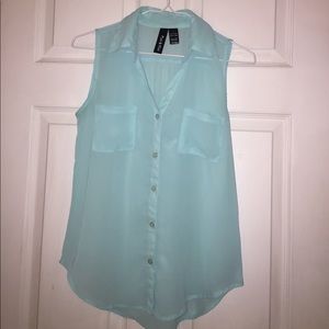 Light blue, sheer button up shirt! Size extra small but fits a little snug. I'm a 32D (according to Victoria Secret- most probably 32B in regular bras) and that is how it fits around my bust. Very pretty!