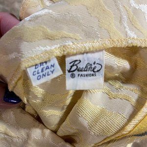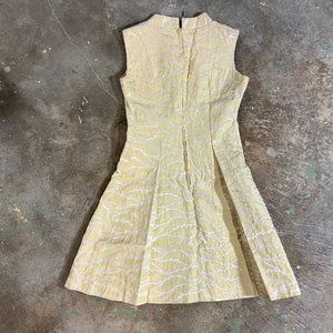 This incredible mid century vintage butter yellow sleeveless dress looks like it came straight out of Mad Men. Woven with a combination of matte and shiny threads in a beautiful organic-looking abstract pattern, this is stunning dress. Looks like there were some minor repairs made in back, and possibly some tailoring over the years, but overall, it's in excellent condition. Measurements laid out are: 17" pit to pit; 36" top to bottom; 14.5" waist at smallest point.