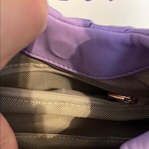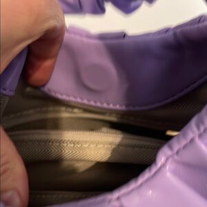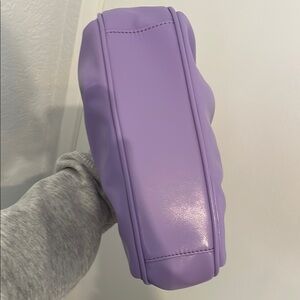 Elevate your style with this chic purple bag featuring a unique ruched handle. Perfect for any occasion. Features a magnet clasp. Condition is like new! One small zipper pocket inside the bag.