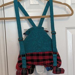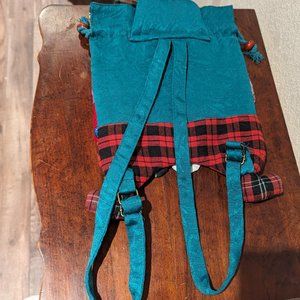 This little backpack could be used for a child or as a small purse. It's made of multi-colored fabrics, possibly handmade, but there are no maker's tags. I purchased it from a small import store a long time ago and put it aside in a bin as a gift, but forgot all about it, so it's never been used. It has a drawstring closure with a snap on the flap. The main compartment measures approx. 7.5" long x 9" long. Overall, it's approx. 13" long. The straps are adjustable and are approx. 22" long.