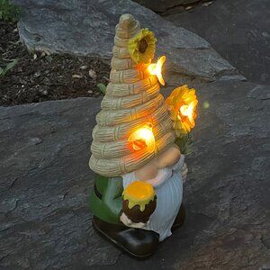 This gnome will make a lovely addition to any location in the garden, on the patio or porch, under tree, along a walkway, or anywhere for a touch of whimsy. It is holding a jar of honey and a sunflower and is adorned with honey bees that illuminate in the dark. The solar function can be turned on or off from a switch at the solar panel on the gnome's back. The solar panel will charge within 5-8 hours during the day and light up automatically at night for 5-8 hours (unless turned off). According to the product description, it is crafted with a polyresin that can withstand all types of weather conditions and will not fade in the sun or rain.