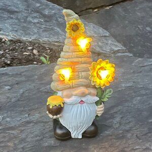 🍀 Adorable Solar-Powered Gnome w/ Honey Bees, Sunflower, and Honey Pot (NWOT)