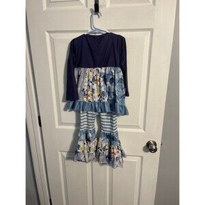 Long sleeve top, 2 front pockets. Pants have elastic waist.