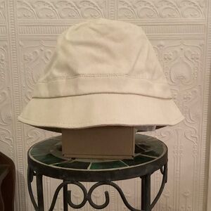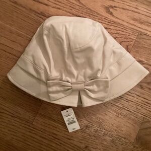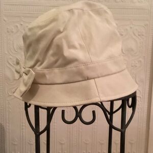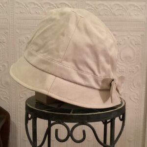 Light beige cotton hat with 1.5” brim, 1” band, and adorable bow and pleat on back.