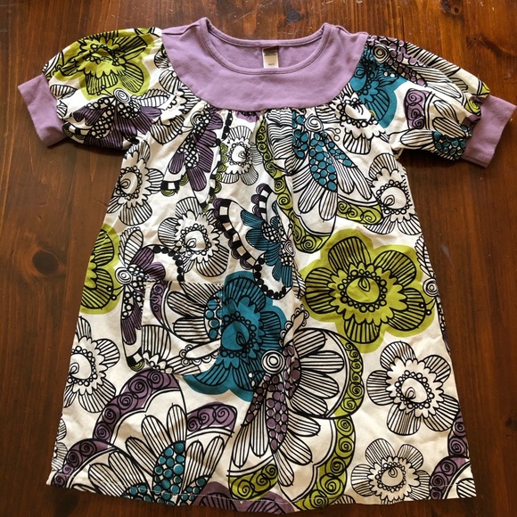 This adorable girls’ dress is new without tags. The purple at the neck and sleeves is soft knit and the brilliant print fabric is cotton. Perfect for spring and summer!