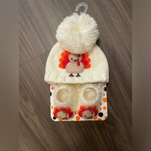 Cute knit hat with turkey design. Matching booties included. Perfect for fall.