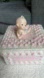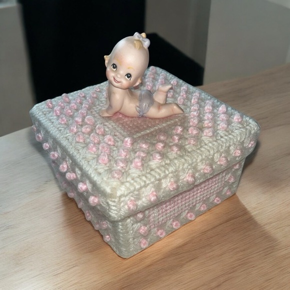 Charming baby figurine on a knitted box. Features pink and cream colors. Perfect for decor or gifting.