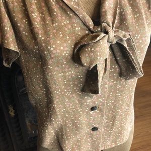 The cutest top! Super light weight and dainty. Pretty brown colorr with purple flowers and white stars. Ties at the chest right before the buttons. Byer California always made the cutest clothes! Excellent vintage condition.