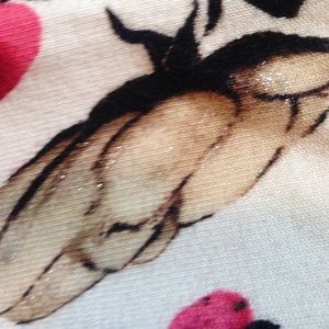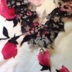 Just precious! 3/4 length sleeves v neck with cute "fringed" decoration, silver button closure, fitted waist line. The tan flowers have a slight shimmer effect to them. Lightweight. I just love this sweater and have worn it often but meticulously cared for it. I live in Florida now though and don't have much use for sweaters so it's time to pass it along.