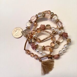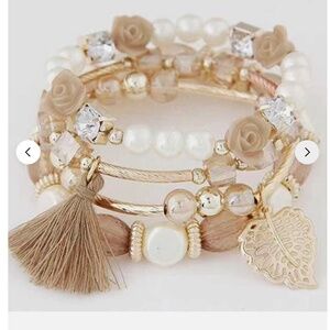 Elevate your accessory game with this stunning bracelet that SCREAMS boho, ethnic, and hippie chic vibes. These four stackable bracelets features beautiful EARTH TONE beads, faceted CRYSTAL beads, round GOLDEN beads and PEARLS, further accented with beautiful roses, and even tassels, all strung together with STRETCH cord for most any wrist size. Unique design, a must have for your collection! Instant style!! THIS ONE HAS IT ALL! Thanks for shopping.