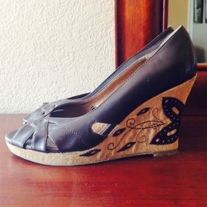 Cute, comfortable and flirty wedges. Brown leather, with brown leather stitched accents on the heel. Worn once, true to size, easy to wear!