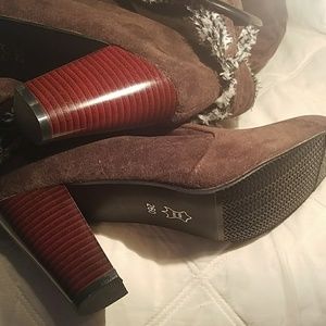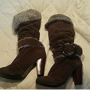 These are simply amazing chocolate to brown boots so many compliments when Worn. The brown is a suede-like material there is a adjustable strap around the heel can be pulled up around the abkle. The top of the boot can be folded over or kept it straight. The boot shaft can be pushed down or pull up. They look adorable with skinny jeans or leggings! I brought several colors and these have never been worn! 23" tall with no fold heel height 3.5"