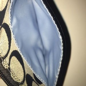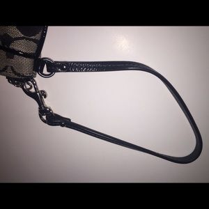 Black and grey Coah wristlet. Hardly worn but in great condition. Absolutely love the baby blue lining on the inside. Has an outside pocket and black leather strap