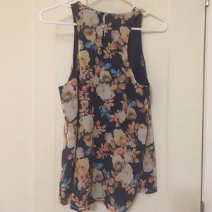 Look at this super adorable floral shell top by J. Crew! Worn a handful of times. Lightweight and flowy, this top is very versatile! Lined in navy to match the ground color of the top layer. Top layer is 100% silk (more of a raw silk than a satin silk) and lining is 100% poly. It even has the little bra strap loops! *Dog friendly home*