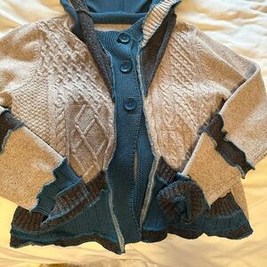 Such a cute recycled sweater. No katwise tag although the person I obtained it from stayed it was. Super cute colors of teal, cream, gray. Fun elf like hood. No size tag but fit me as a 8/10. Excellent condition. No piling or flaws.