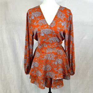Super cute boutique Playsuit! Surplice wrap top with button closure. Tie waist for a snatched look. Flowy skirt over shorts for a dress look. Perfect fall romper! Euc