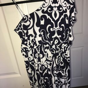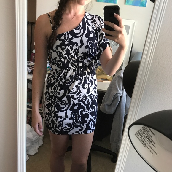 This dress is great for outdoor events (weddings, wine tastings, parties), it is super comfortable and very fun to wear! One shoulder but it has a thin strap on one shoulder. Fits me a little snug but it still doesn't look like a bodycon dress, so it would work for those size medium! For reference, I am 5'8!