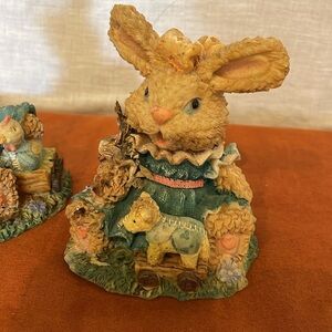 Charming bunny figurines wearing blue overalls and blue dreSS. Perfect for decoration.