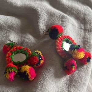 Adorable quirky super lightweight Pom Pom earrings from an artisanal craft market in New Delhi. Front and back of earrings feature a mirror following old Indian mirrorwork craft traditions. Add some fun and a pop of color to any outfit! Measures around 2 inches long. Bought a few years ago in India and never worn — in excellent condition.