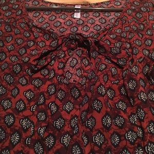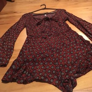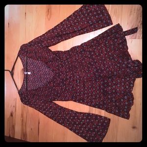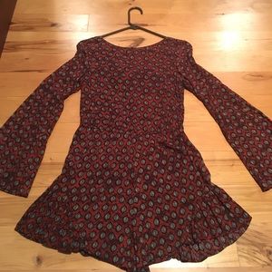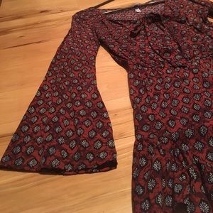 Boho tie-front romper with bell sleeves, flirty ruching at shorts, and a fun print! Shades of rust red, maroon, and black and white print on cotton/poly blend. Elastic at natural waist, 2" inseam, runs a little petite. Modern romper with a bohemian feel, perfect with suede boots and a floppy felt hat!