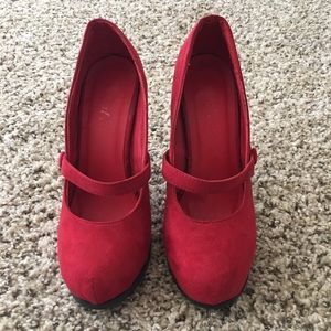 These adorable red swede heels are in good condition with normal wear and tear. They are about a 5 inch heel and run about a half size big.