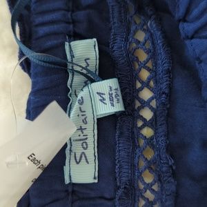 blue and white tie die pattern with drawstring waist, lacey leg trim, 3/4 sleeves and off shoulder top. new with tags