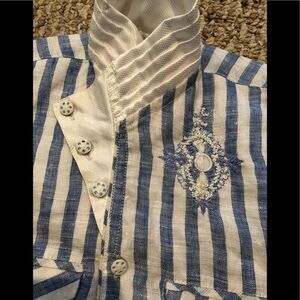 Adorable linen sleeveless vest in size 1. No label with brand name or material information. But is is very cute. Had 2 pockets upfront. It says size 1 . Length is 13.5” and from armpit to armpit is 12”.