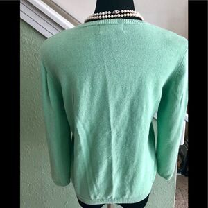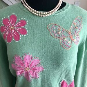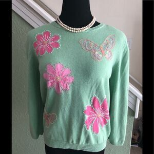Beautiful knitted sweater by Alfred Dunner in size petite medium. 55% ramie, 45% cotton. Has very light shoulder pads that can be easily removed. Light wear excellent condition.
