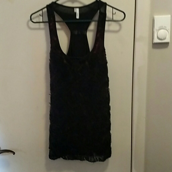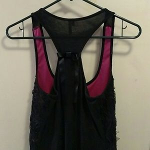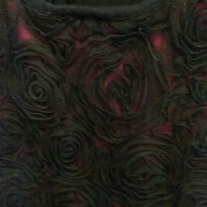 Size small. Hard to see how cute this tank is through pictures. Has a pink lining and then a layer of black rosettes. When on, the pink really pops through. Wish it still fit.
