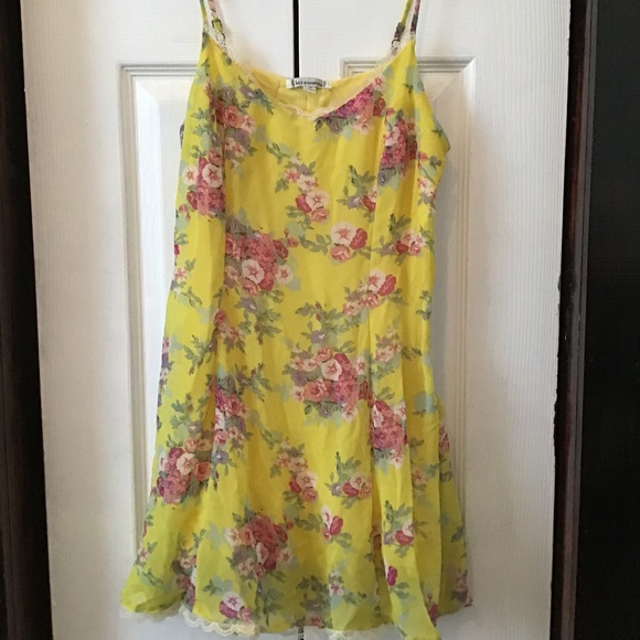 Transparent slip-like dress, floral on yellow with solid yellow lining, lightweight and bouncy, in excellent used condition, adorable, picnic perfect. All measurements approximate to the best of my ability with garment lying flat. Fits closer to small than xs.