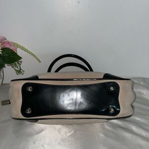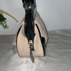 Preowned in excellent condition Faux Suede and Patent Leather Zip top closure 1 interior zip pocket 2 roll top handles 4 bottom feet