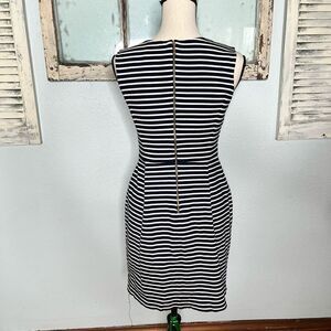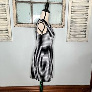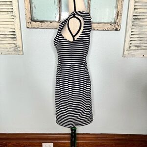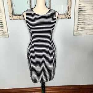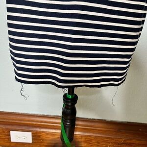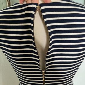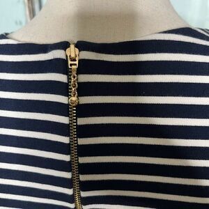 Adorable size 6 sleeveless, fitted dress by Kate Spade. With white, and navy blue horizontal stripes and raw bottom hem. Functional back clasp and gold accent zipper closure. It’s the perfect dress for those summer functions like weddings, graduation parties, the list goes on and on. It’s absolutely stunning on and has slight stretch for a fitted figure flattering look. It’s in excellent used condition with no known flaws. Comes from a smoke free home.