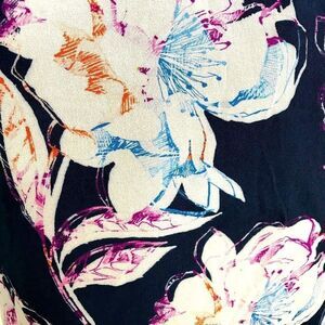 Adorable size 6 French Connection brand floral tee. With navy background and light purple, blue, orange, and pink floral design is gorgeous. Pictures do not do the colors justice. The sleeves are sheer, so different than the rest of the shirt. The back has a small keyhole opening with a gold square clasp for a closure that’s functional. This shirt is in excellent used condition with no known flaws. Comes from a smoke free home.