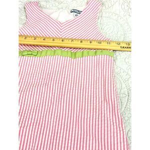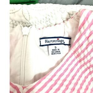 Super cute little girl's seersucker summer shift dress pink with green grosgrain ribbons by Hartstrings brand, known for their great quality outfits for kids. Dress is in excellent pre-owned condition, and measurements and material are listed in the photos.