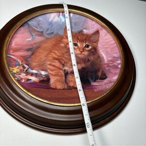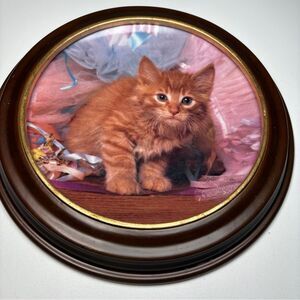 Round wall art featuring a cute orange kitten. Perfect for cat lovers. For all the kitty lovers out there! Perfect to hang in the wal. Some flaws but given the age still in great condition.