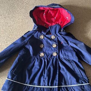 Nautica navy blue infant sailor jacket/pea coat with removable hood. Hood is lined with a cute watermelon pink polka dot and sailboat print. Trimmed with white piping around cuffs, hood and hem. Epaulettes on shoulders, 3 button and 2 velcro closures, flared at waist, functional front pockets. Gently worn and laundered with no flaws to note. I wish I had a jacket like this in my size…it is so cute!!