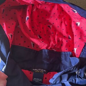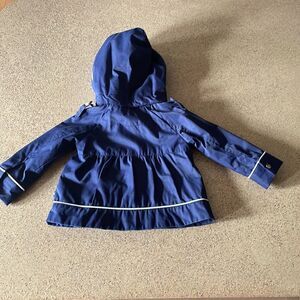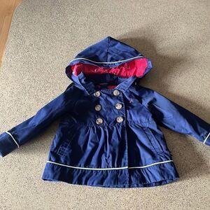Nautica navy blue infant sailor jacket/pea coat with removable hood. Hood is lined with a cute watermelon pink polka dot and sailboat print. Trimmed with white piping around cuffs, hood and hem. Epaulettes on shoulders, 3 button and 2 velcro closures, flared at waist, functional front pockets. Gently worn and laundered with no flaws to note. I wish I had a jacket like this in my size…it is so cute!!