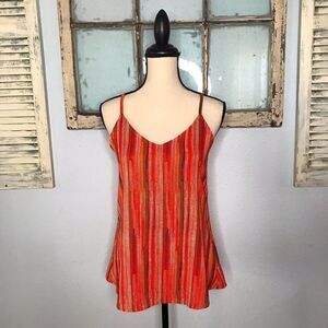 Adorable size small boho style tank by Tulle. With red background and green, blue, white, yellow, and orange stitched arrow design various lengths. Thin shoulder straps crossing at the back and wooden style boho beads on the straps. It’s in excellent used condition with no known flaws. Comes from a smoke free home.