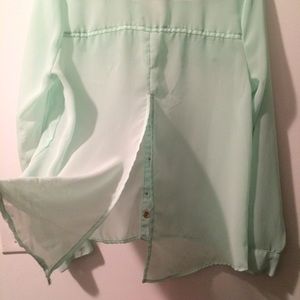 I'm in absolute love with this top and it will be hard to let go, in great condition, looks beautiful on. Mint chiffon material, not a tight button up top because as shown in the second photo there is a slit in the back which makes it even cuter and can be worn with a tank under. Only flaw is that the 2nd button is missing but this is very hard to notice when the button above (1st button) is open. Overall great shirt😊
