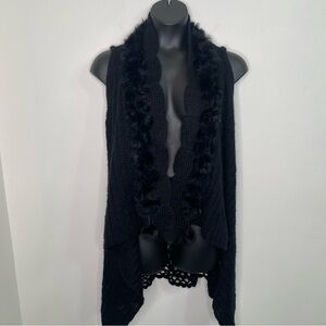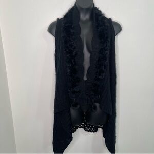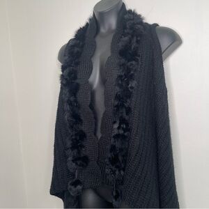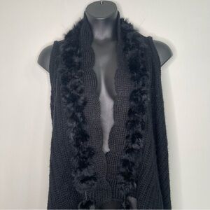 Elevate your wardrobe with this luxurious black open-front knit vest. Featuring a sophisticated scalloped edge design, the vest is adorned with plush faux fur trim along the collar, adding a touch of elegance and warmth. Its flowing asymmetrical hem creates a flattering silhouette, while the soft knit fabric ensures comfort and versatility for layering over casual or formal outfits. Perfect for chilly evenings or a statement piece for any occasion, this vest effortlessly combines style and coziness.