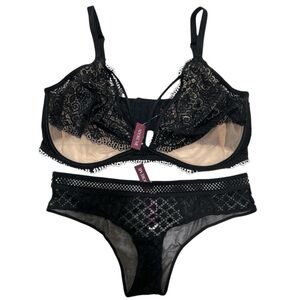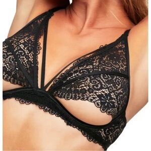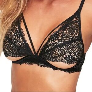 Preowned with tags. This bra features delicate lace cups with a unique open bottom cup detail that adds a touch of allure to the overall design. The soft straps at the neckline add a comfortable and secure fit while the cups are showcasing a hint of skin, creating a balance of modesty and sensuality.