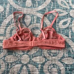 This Adore Me bralette features a delicate pink lace overlay with a subtle brown hue peeking through. It has a beautiful scalloped lace trim and a small bow detail at the center. The straps are adjustable, and the back has a hook-and-eye closure. This bralette is designed for comfort and a flattering fit.