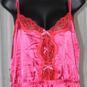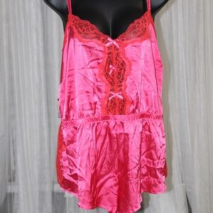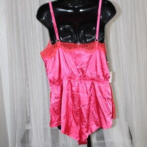 Adore Me. Plus Size Cilla Romper Lingerie. Soft satin material with a luxurious sheen. Delicate lace trim along the neckline and bodice. Adjustable spaghetti straps. Elastic waist for a flattering fit. Decorative lace panel with mini satin bows in front. Lightweight and comfortable — perfect for sleepwear or special occasions
