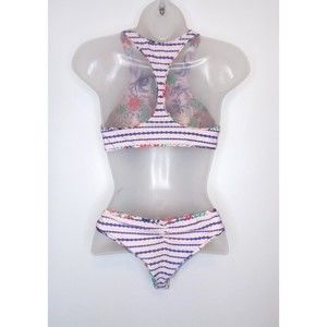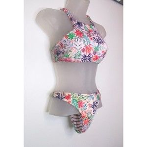 Style: Reversible Tropical Print on One Side & Striped on the Other - High Neck Full Coverage (great for a fuller bust) - Cheeky Scrunch Butt Bottoms